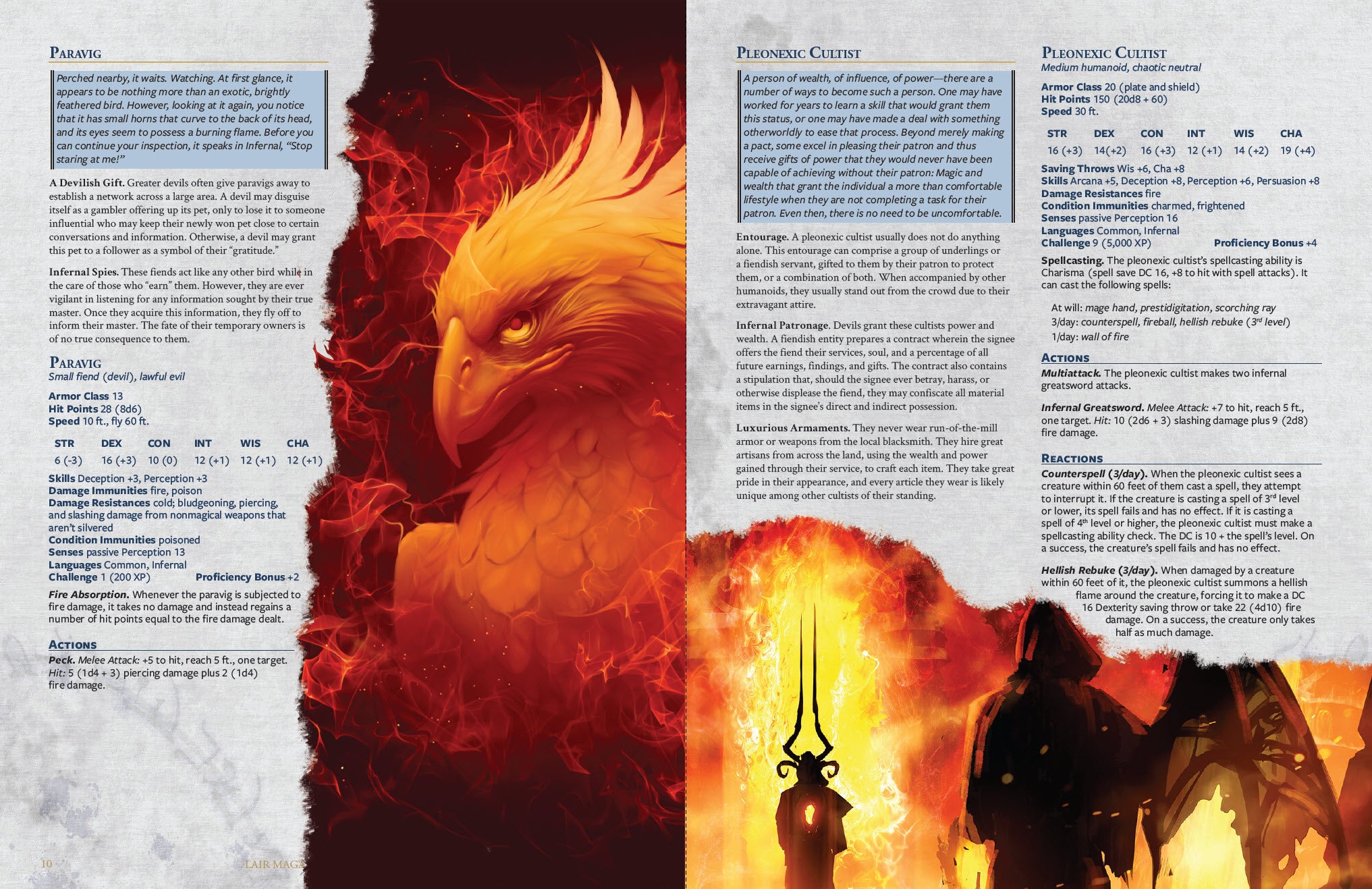 Hell's New Recruits - Ten monsters: Covetous Cultist, Fiend Cultist Initiate, Hellsmog Giant, Hexmare, Hoard Golem, Nimbus Elemental, Paravig, Pleonexic Cultist, Stentorian Owlbear, and Veildrop..