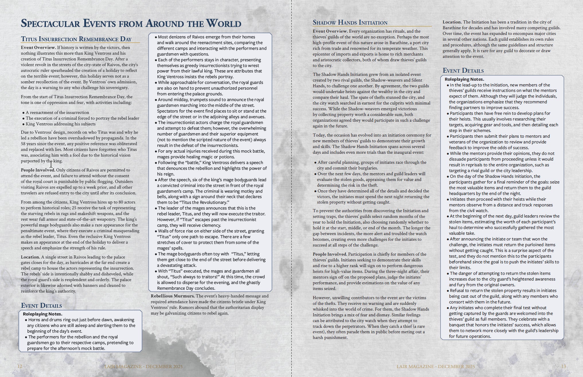 Spectacular Events from Around the World - Two special events: Titus Insurrection Remembrance Day and Shadow Hands Initiation.