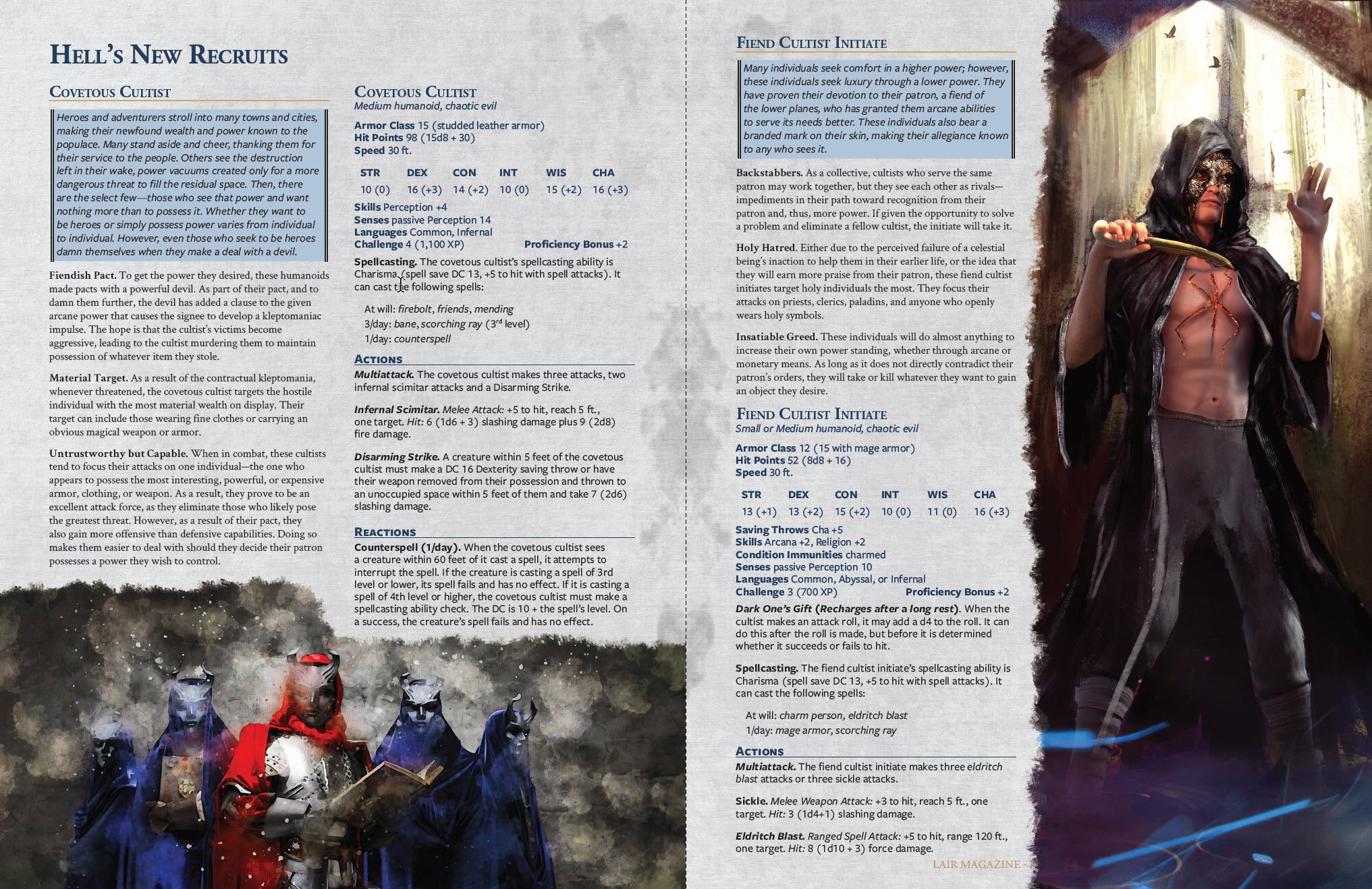 Hell's New Recruits - Ten monsters: Covetous Cultist, Fiend Cultist Initiate, Hellsmog Giant, Hexmare, Hoard Golem, Nimbus Elemental, Paravig, Pleonexic Cultist, Stentorian Owlbear, and Veildrop..