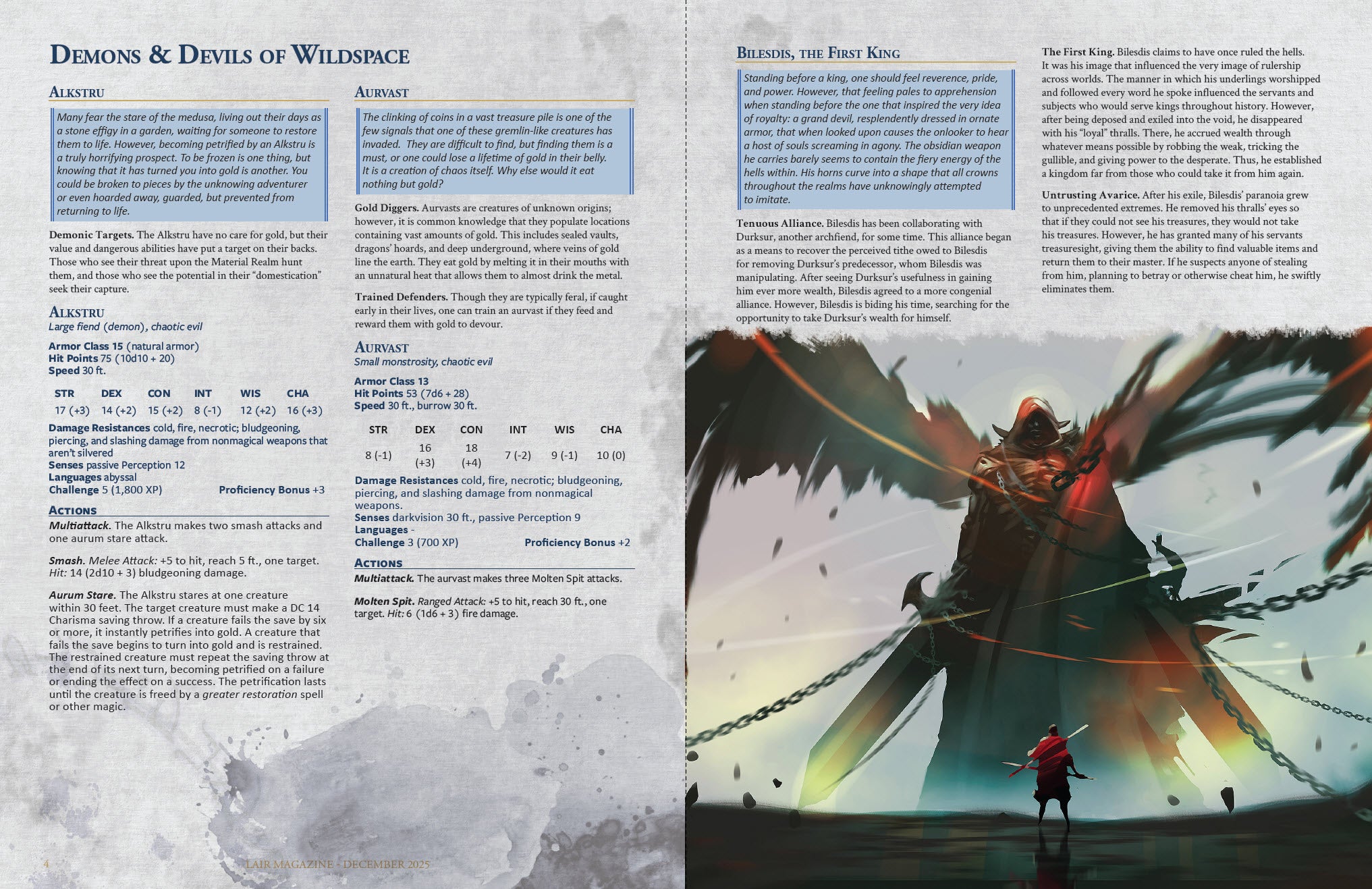Demons & Devils of Wildspace - Ten monsters: Alkstru, Aurvast, Bilesdis the First King, Cosmic Drifter, Durksur, Fidurum, Fiend Knight, Infernal Welcher, Serranznha, and Void Fiend.